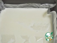 5. Снять с огня и вылить в прямоугольную форму, застеленную пленкой. Когда желе застынет, нарезать его кубиком и выложить в основу. |