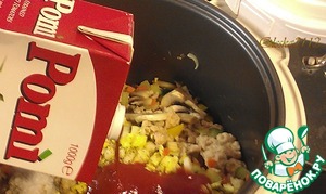 Теперь содержимое чаши мультиварки необходимо залить протёртыми помидорами (томатами). И здесь множество вариантов, которые я периодически использую. Это могут быть в сезон обычные помидоры, измельчённые кухонным комбайном или блендером. Томатный сок или томатная паста, разведённая водой по вашему вкусу. Или же, как у меня, готовая протёртая томатная масса. Но её объём должен быть 500 - 700 мл.