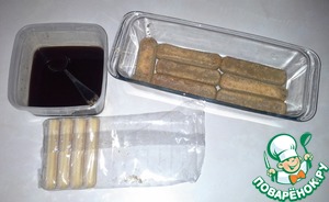 Теплый или горячий кофе наливаем в удобную миску и промокаем в нем печенье савоярди по очереди. Поскольку печенье сухое, то оно очень быстро впитывает кофе, а значит надо следить за тем, чтобы оно не размякло.