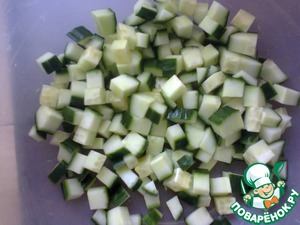 Мелкими кубикими порежем огурчик. Если шкурка очень плотная или горькая, предварительно очистим её.