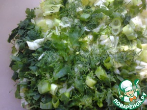 Укроп и остальную зелень мелко нарезаем и добавляем к салату и огурцу.