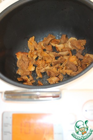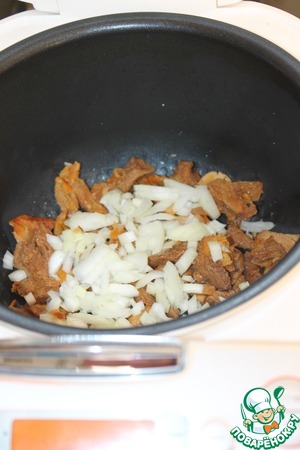 Добавить нарезанный кубиками репчатый лук, обжарить и убрать из чаши. Чашу не мыть