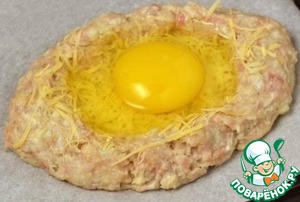 В каждую «ямку» разбиваем яйцо. Сделать это нужно аккуратно, чтобы белок не перелился через край. Вокруг желтка снова посыпаем сыром.