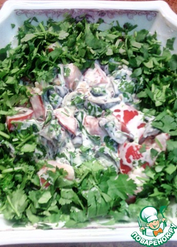 Вторую половину пучка кинзы крупно порубить и посыпать салат по периметру. Приятного аппетита!