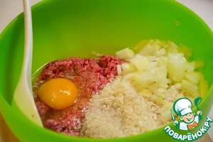 Готовим фарш для тефтелей. Мясной фарш, рис, лук, соль, специи соединяем и перемешиваем.