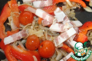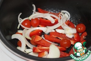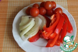 Перец и лук порезать перьями, помидорки черри оставить целыми