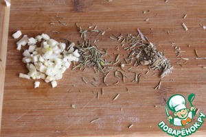 Чеснок порубить, мелко порезать сушеные травы. Если у вас найдутся свежие, то это просто прекрасно