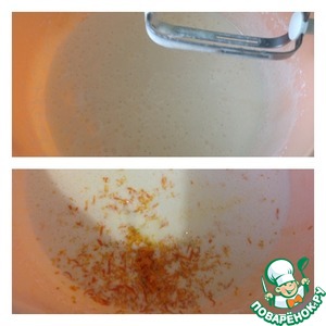 Яйца взбить с сахаром и ванилином в пышную массу. Добавить сок и цедру мандарина, перемешать.