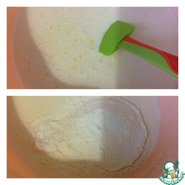 Добавить кефир и растопленое масло, взбить. Далее разрыхлитель с мукой, взбиваем