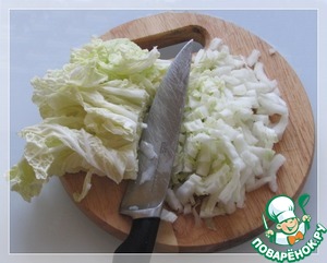 С вилка пекинской капусты снять верхние 8 листов, остальную капусту мелко порубить.