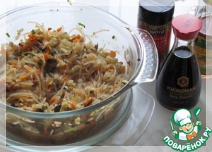Пикантные постные голубцы с овощами и рисовой лапшой.