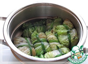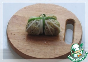 Начинить ошпаренные листья тушеными овощами, обвязать луковым стеблем.