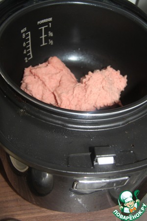 В чашу мультиварки (не забудьте протереть после фарша) выливаем половину теста, кладем начинку.