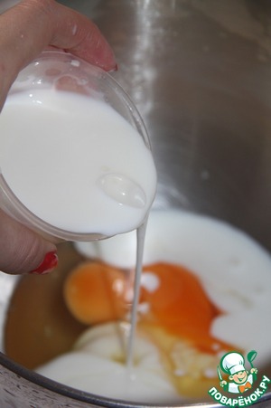 • Приготовим тесто для нашего пирога. В миску разобьем яйца и добавим кефир.