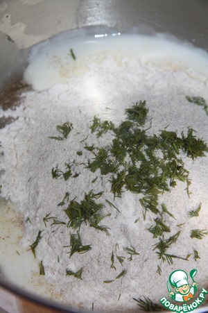 • Всыпаем 2 вида муки, разрыхлитель, соль, перец и свежий нарезанный укроп.