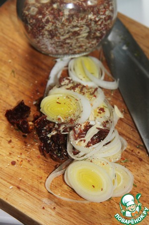 • Лук-порец нарежем кольцами, добавим немного сушеных томатов и молотый чеснок.
