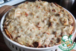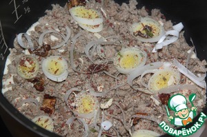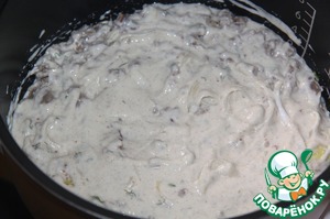 • В чашу мультиварки (не забудьте протереть после фарша) выливаем половину теста, кладем начинку.