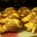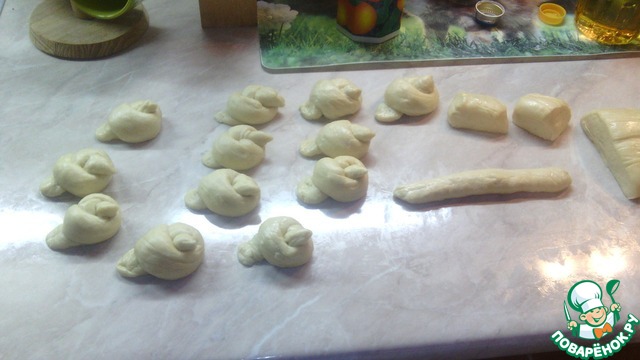 Тесто скатываем на столе в большой жгут, делим ножом на равные кусочки. Всего должно выйти из этого количества 24 жаворонка. Хотя по традиции надо печь 40, по числу мучеников. Раскатываем каждый кусочек руками в жгутик длиной 15 см. Из жгутиков делаем обычный узелок, формируя из одного кончика головку с острым клювиком, другую придавливаем пальцами в хвостик -
