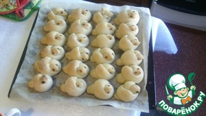 Высаживаем наших птичек на противень, покрытый бумагой для выпечки. Делаем глазки из кусочков изюма или фиников ( у меня). Хвостики можно разрезать и разделить, но мне больше нравится так