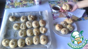 Подошедшие жаворонки смазываем крепким сладким чаем и сажаем в разогретую до 180 гр. духовку -