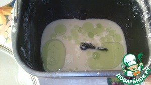 Постепенно вливаем жидкость в закваску, перемешивая блендером. Получившуюся жидкость я переливаю в хлебопечку, где и замешиваю тесто -