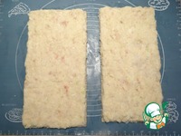 Острым ножом разрезаю вафельные коржи с фаршем на кусочки. |