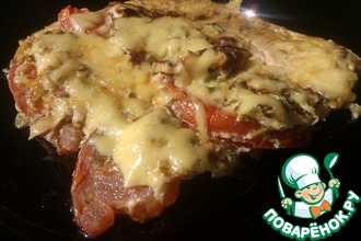 Выложить по бокам формы помидоры срезом внутрь, дно - срезом вверх. -