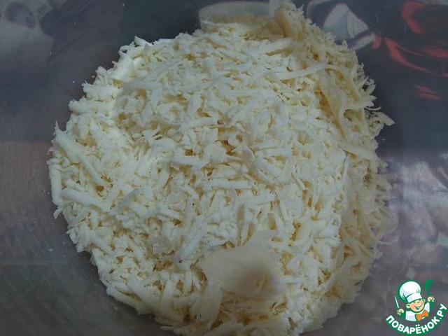 В это время приготовим начинку: сулугуни натереть на крупной терке. Если он окажется суховатым, можете добавить немного сливочного масла. Начинка готова.
