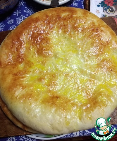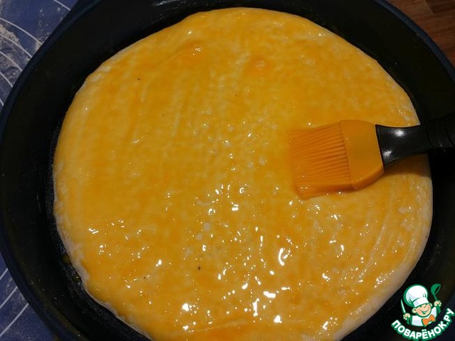 Взбейте слегка желток и смажьте лепешку. Я еще дополнительно смазала столовой ложкой сметаны для хрустящей корочки, но это не обязательно.