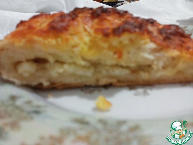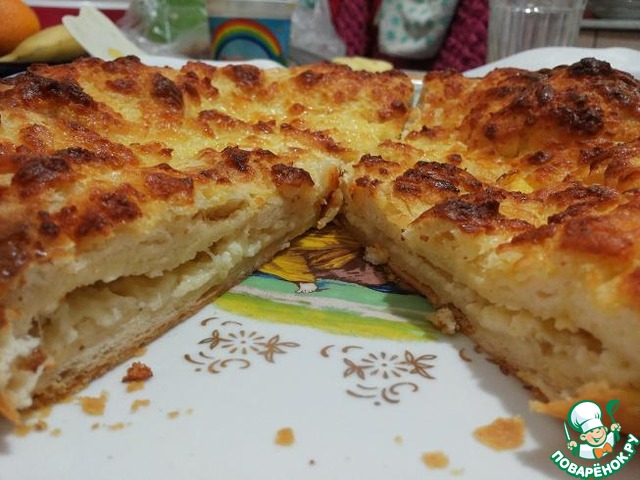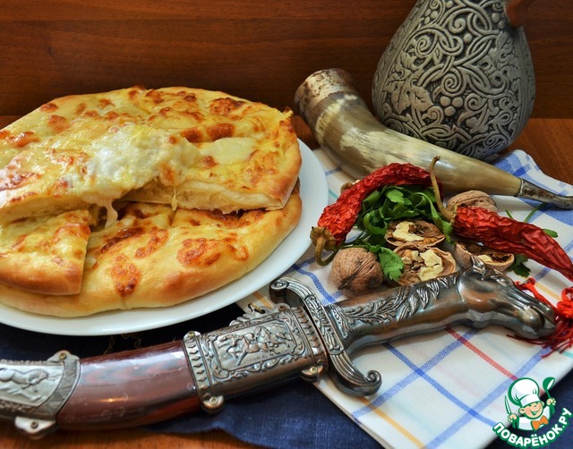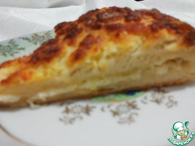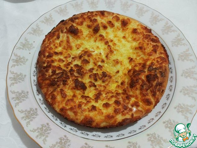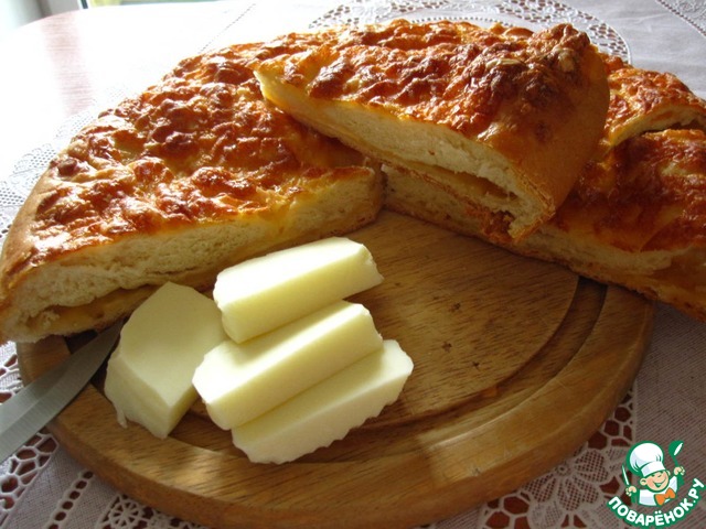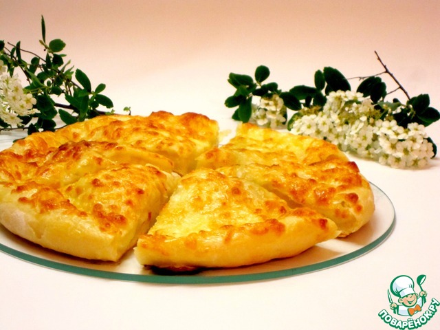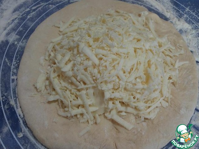 Из готового теста скатайте шарик, из него - лепешку диаметром 20 см. Выложите в центр половину натертого сыра (150 г).