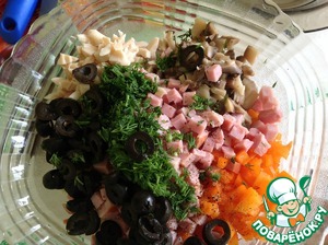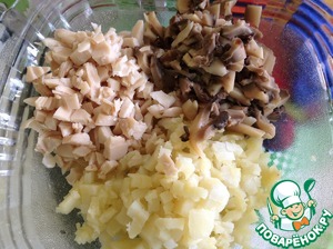 С кальмаров и грибов слить жидкость и нарезать кубиками, добавить так же порезанный картофель