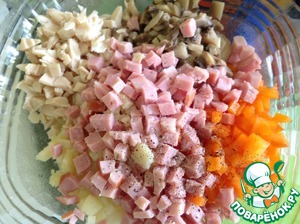 Ветчину и перец порезать кубиком и добавить к салату. Соль и перец по вкусу