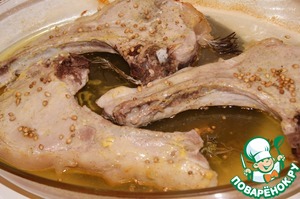 Посолить и поперчить, смазать горчицей и оставить на 30-40 минут в прохладном месте.