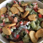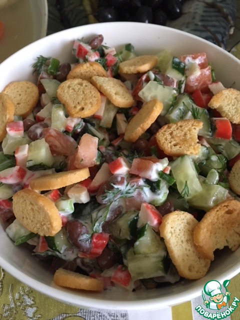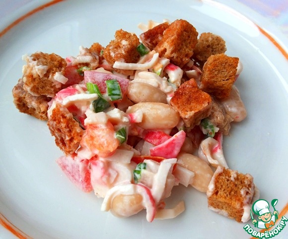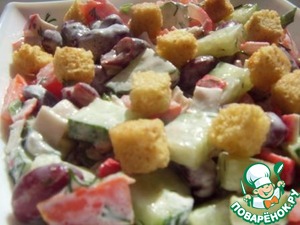 Майонез перемешать с чесноком. Перемешать салат, посолить и сверху посыпать сухариками.