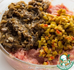 Грибы и оливки добавить к фаршу и еще раз тщательно вымешать. -
