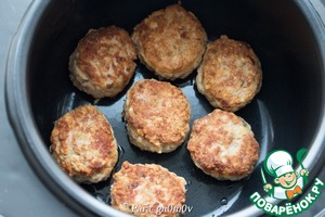 В чашу мультиварки налить масло, выбрать режим Поджаривание 15 минут и обжарить котлеты с двух сторон до румяной корочки (примерно 10 минут). -