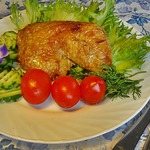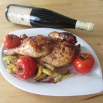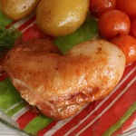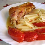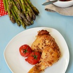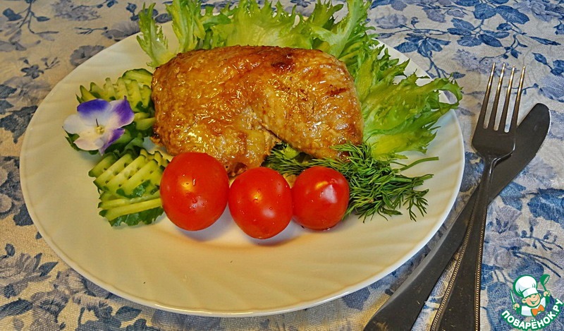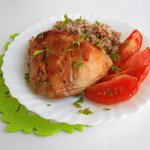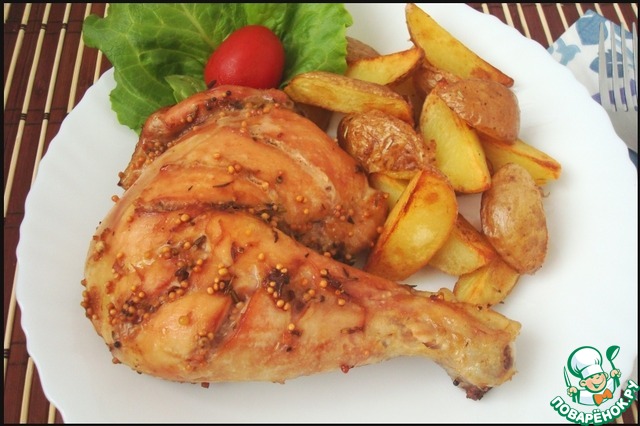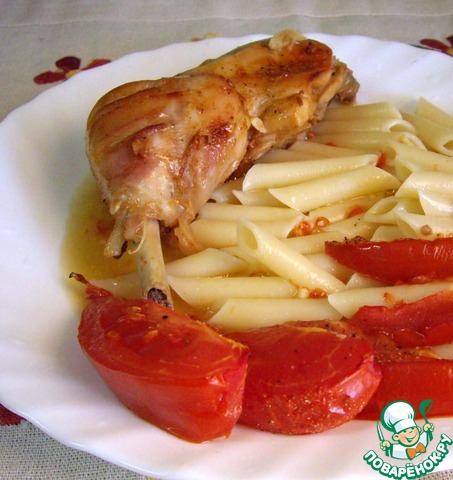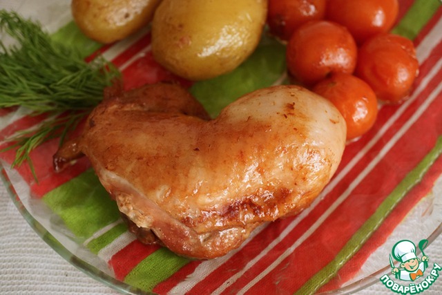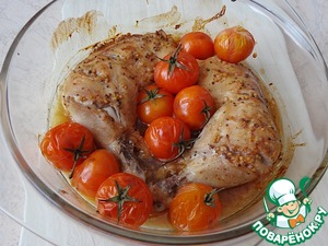 Окорочка обязательно гарнируйте запеченными помидорками. Я еще добавила к гарниру несколько ломтиков жареного сельдерея (Света СНежк_а, спасибо!) и отварного картофеля. Попробуйте, это вкусно! Я окорочка не очень люблю и всегда мариную еще кусочек грудки. Но она получается суховата. Мне нравится, но грудка все ж на любителя. А мои домашние с удовольствием едят окорочка, приготовленные по этому рецепту.