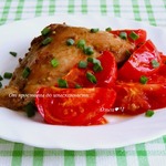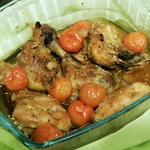 Снимите фольгу и полейте окорочка образовавшимся соком. В промежутки между ними положить помидоры черри. Запеченные помидоры придают окорочкам дополнительную сочность. Снова поставьте в духовку минут на 15, но уже без фольги.