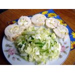 В глубокую сковородку уложить рулеты, залить холодной водой. Отварить в течении полутора часов, остудить в полученом бульоне.