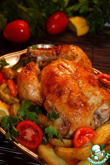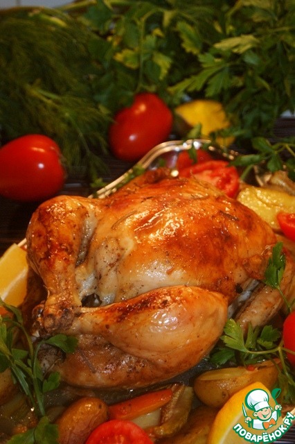 Сервировать курицу вместе с запечеными и свежими овощами и зеленью, во время еды мясо поливать лимонным соком.