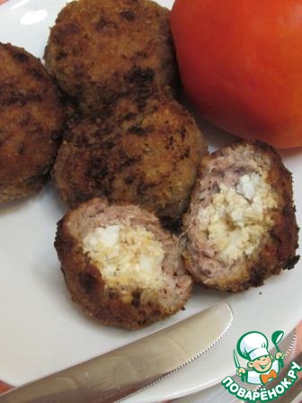 Берем примерно полную десертную ложку фарша, делаем из него лепешку. На лепешку кладем чайную ложку начинки. Аккуратно "натягиваем" фарш на начинку и формируем шарики.