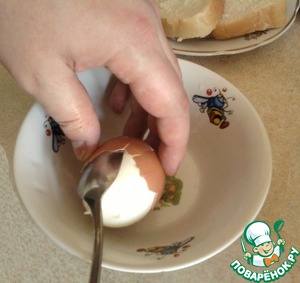 Для начала сварите яйца всмятку. От закипания, проварить яйца 2 минуты, не больше, так будет вкуснее. Хорошо, когда белок даже не весь свернётся. В этот раз, когда мы готовили, яйца проварились чуть больше, и уже немного было не то. Почему, чуть дальше объясню. При помощи ложечки освободите яйца от скорлупы.