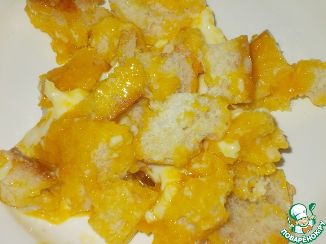 Теперь сверху покрошите хлеб. Хлеба надо столько, чтобы он впитал жидкость яиц. Чем больше жидкости будет в яйцах, тем будет вкуснее. Хлеб впитает её и лучше размякнет. Поэтому я советую не переваривать яйца. В противном случае «деликатес» получится суховатым. Перемешайте.