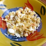мы используем другой вариант: 4-5 яиц отвариваю вкрутую, в горячем виде рублю ножом, добавляю примерно 30-50 гр сливочного масла (яйца должны быть горячими, чтобы растопилось масло), солю и намазываю на хлеб или булку. очень вкусно с чаем/кофе и особенно хорошо уходит в выходной, если с утра лень готовить