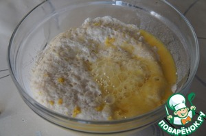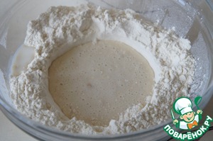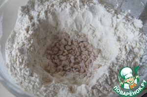 Муку просеять в миску, сделать углубление и раскрошить в него дрожжи.