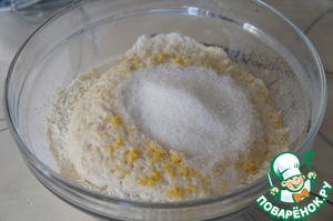 Добавить в опару сахар, щепотку соли и лимонную цедру.