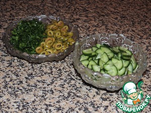 Тонко порезать огурец. Мелко покрошить петрушку (прекрасно подойдут также кинза, мята, зеленый базилик - по вашему вкусу). Оливки нарезать колечками.