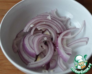 Лук нарезаем полукольцами и заливаем соком лимона, отставляем мариноваться.