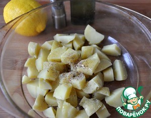 Картофель отвариваем с кожурою (в "мундире"). Горячий картофель чистим, нарезаем кубиками, посыпаем свежемолотой смесью перцев, солим, поливаем соком лимона и растительным маслом.
