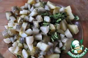 Добавляем к картофелю нарезанные кубиками маринованные корнишоны и мелко нарезанную зелень кинзы.